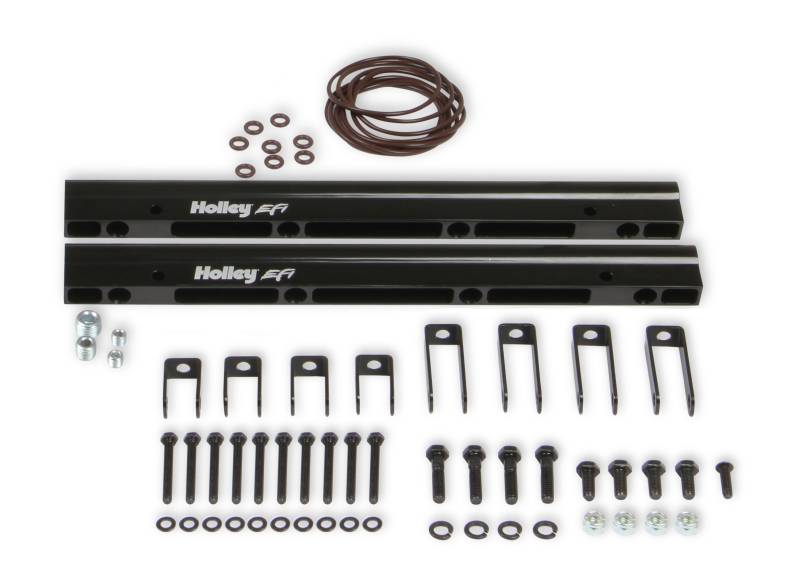 The LS Race single-plane intake manifold is designed for hi-performance/racing engine applications, 5.3 to 6.2+ liter displacements, N/A or with power adders. The large volume 4500 plenum and optimized runners provide airflow potential for Hi-RPM engines with max power at 7500-8000+ RPM.\nThe manifold with AN-8 fuel rails fits GM LS Gen III engines with cathedral port heads and has a 4500 Dominator style carb flange for carburetors, EFI throttle bodies, or EFI throttle body elbows, and is configured with a LS MAP sensor port along with other NPT plenum vacuum or air-temp sensor ports.\nThe new Holley Single-Plane Race intake manifold is designed with maximum performance in mind. Featured is a two-piece split design that provides access for all levels of porting and modification. With shoulder bolt locators and O-ring seal, disassembly & reassembly is simple and precise.