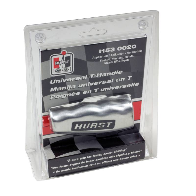 The Hurst Brushed Universal T-Handle is made of die cast aluminum and features that bold HURST identification to add a stylish touch to your cars shifter. As you grasp this T-Handle firmly in the palm of your hand, you will automatically gain a sense of control and satisfaction. Includes adapters and jam nuts to fit 3/8-16, 7/16-20, 1/2-20, 10mm, 12mm and 16mm threads.