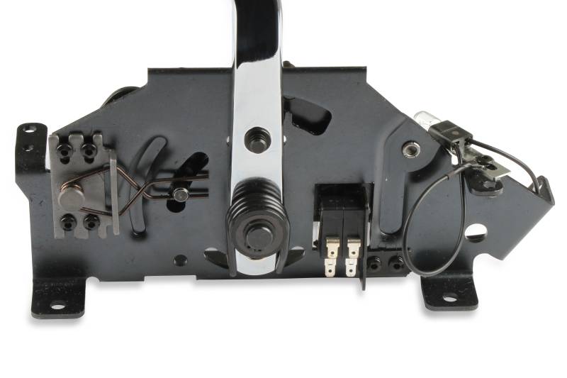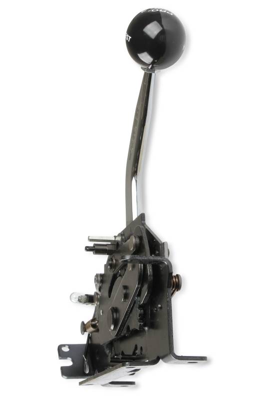 The Hurst® Pro-Matic®2 ratchet shifter with its chrome-plated stick and black knob is quality engineered for years of precise, trouble-free operation. Once the shifter is installed, the textured console and brilliant top cover that can be trimmed to fit any floor contour integrate the shifter with the interior. While easy on the eyes, this shifter is not all about looks. On the street, you will enjoy the ride as you freely tap the stick from gear to gear. If you decide to transfer your beauty of a machine to the track, give it all you've got because this shifter is built to handle the most powerful shifts, and the special positive reverse Loc/Out meets NHRA and IHRA technical requirements. This shifter comes complete with all the hardware required to make installation a breeze including a 5-ft long heavy-duty shifter cable and instructions. Also includes a neutral safety and backup light switch assembly. Notes: Ford AOD transmissions require a B&M cable bracket & lever kit 40496. Compatible with Fwd/Rev pattern valve bodies. Overall Dimensions 12.65L x 5.6W x 11.5H