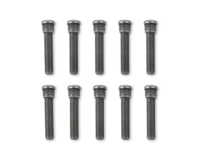 NHRA Approved. Extra long wheel studs are used in competition applications where open end lug nuts are used to show full lug engagement. They are also used in applications where thicker/wider wheels or the use of wheel spacers requires a longer than stock wheel stud. These Grade 8 press-in wheel studs have a black oxide finish. 1/2-20 thread and 2-7/8 inch long with an approximately .660 inch knurl diameter. Length from bottom of the head to where the taper begins is approximately .350 inch and length from bottom of the head to where the taper ends at the thread is about .590 inch. Sold as a set of 10.