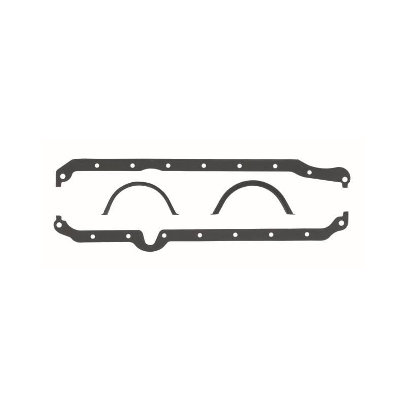 Manufactured from cellulose/nitrile composition gasket material. A black latex rubber coating is applied to outside of gasket to help seal minor oil pan rail irregularities and eliminate the possibility of oil leakage. Provides excellent sealing and durability. Complete with molded rubber front/rear oil pan seals. For original equipment replacement, high performance street, drag race and oval track.