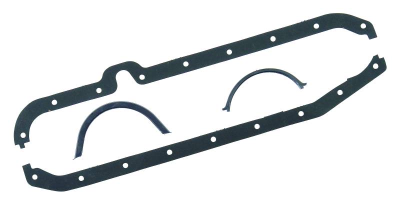 Manufactured from cellulose/nitrile composition gasket material. A black latex rubber coating is applied to outside of gasket to help seal minor oil pan rail irregularities and eliminate the possibility of oil leakage. Provides excellent sealing and durability. Complete with molded rubber front/rear oil pan seals where applicable. For original equipment replacement, high performance street, drag race and oval track.