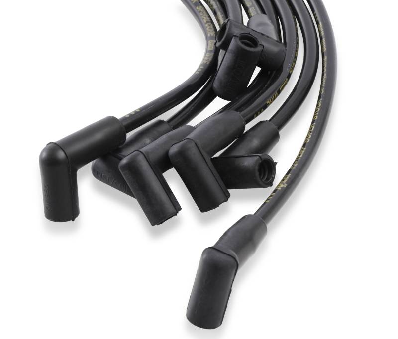 The traditional ACCEL combination of yellow wire and red spark plug boots has been added to these SuperStock Spiral Core 5000 Series wire sets, which feature color-matched wire and spark plug boots in blue, black, and red. With only 500 ohms/ft. of resistance, more ignition energy can reach the spark plug, producing a longer-lasting, hotter spark flame kernel. The results is higher performance through improved efficiency, quicker throttle response, and reduced emissions. This 8mm wire's double silicone construction is rated to 550 degrees F. The high-gloss wire jacket resists moisture, chemicals, and heat extremes for longer life and great looks. The fiberglass braid adds greater pull strength and terminal retention, while the stainless steel spark plug terminals provide excellent long life, electrical conductivity, and corrosion resistance. Both universal and custom-fit applications are available for early and late model cars and trucks.