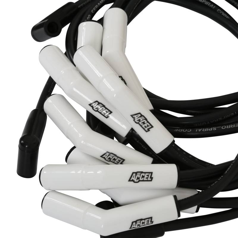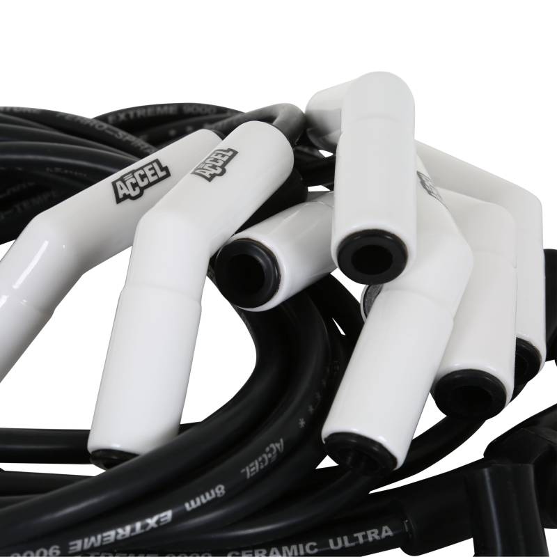 ACCEL now offers the cure for burnt spark plug boots with Extreme 9000 Ceramic wire kits. The 8mm Ferro-Spiral core wire now has ceramic boots on the spark plug end of the wires. Ceramic boots withstand up to 2,000 degrees. Great for running headers with close tolerances, an engine bay with little room, or an RV with boots that melt because of heat. Ultra high temperature double silicone construction wire rated at 600 degrees fahrenheit peak. 500 ohms/ft Ferro-Spiral core developed for performance use. Excellent energy delivery to the spark plugs, while providing the highest level of RFI/EMI suppression. Stainless steel spark plug terminals for maximum spark energy to the plugs. Pre-made to factory lengths for a perfect fit.