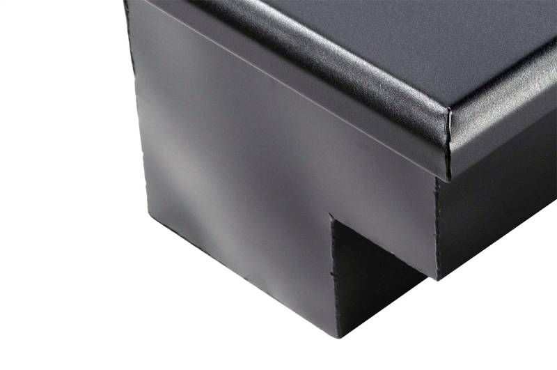 Dee Zee Tool Box - Hardware Series Side Mount Boxes. Constructed of durable 20-gauge steel. Protected by texture black NRT(TM) (No Rust Technology) rust inhibitor powder coat finish. Crown style lid with a full pan double-V stiffener for superior rigidity. Other features: lockable stainless steel paddle handles, dampened gas shocks, closed cell foam gasket, and self-adjusting strikers.