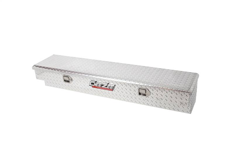 Dee Zee Tool Box - Red Label Side Mount Boxes. Constructed of heavy duty Brite-Tread aluminum. Crown style lid for superior rigidity. Other features: lockable stainless steel paddle handles, dampened gas shocks, closed cell foam gasket, and self-adjusting strikers. Great storage by themselves or matched with our crossover Tool Boxes.