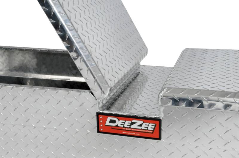 Dee Zee Tool Box - Red Label Double Lid (Gull Wing) Crossover. Constructed of heavy duty Brite-Tread aluminum. Crown style lid for superior rigidity. Other features: lockable stainless steel paddle handles, dampened gas shocks, closed cell foam gasket, and self-adjusting strikers. Removable plastic tool tray to help keep small items organized.