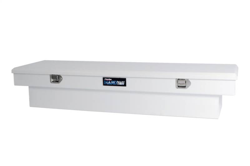 Dee Zee Tool Box - Hardware Series Single Lid Crossover. Constructed of durable 20-gauge steel. Protected by wrinkle white NRT(TM) (No Rust Technology) rust inhibitor powder coat finish. Crown style lid with a full pan double-V stiffener for superior rigidity. Other features: lockable stainless steel paddle handles, dampened gas shocks, closed cell foam gasket, and self-adjusting strikers. Removable plastic tool tray to help keep small items organized.