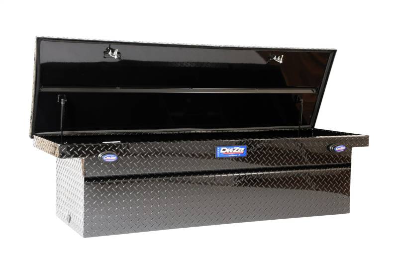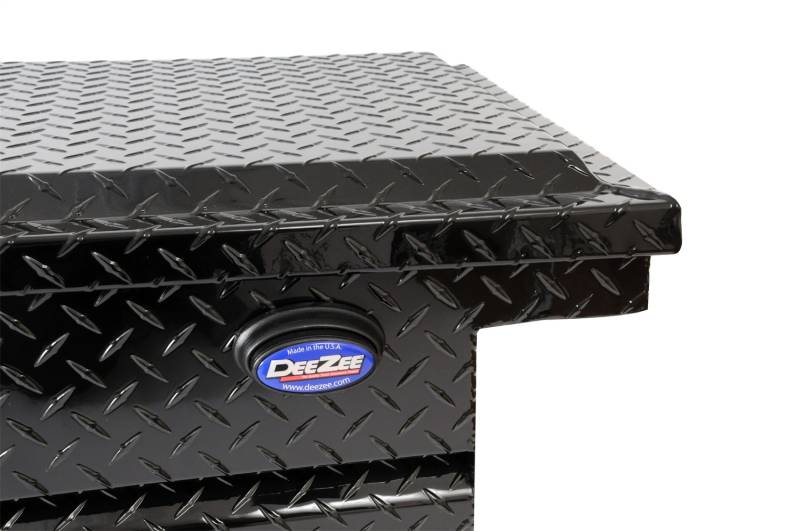Dee Zee Tool Box - Blue Label (Contractor Grade) Single Lid Crossover. Constructed of heavy gauge Brite-Tread aluminum. Large push button with self-adjusting latches. Hidden hinge, gas shocks, Alumaguard strengthening channel, and adjustable strikers on a hat style lid.