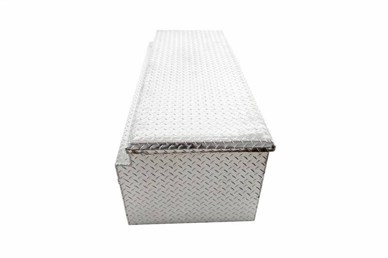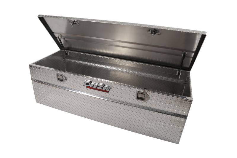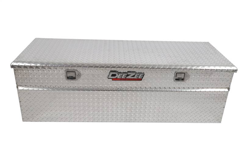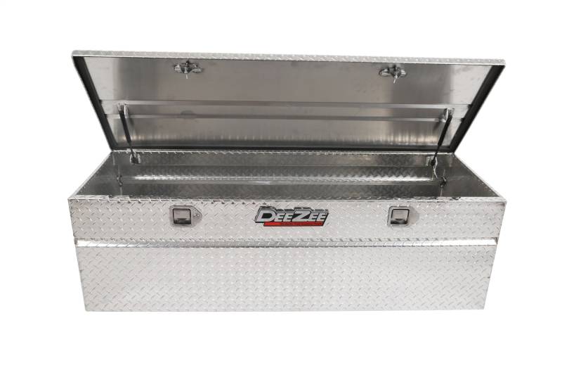 Red Label Utility Chest Dee Zee Tool Box - Red Label Chest. Constructed of heavy duty Brite-Tread aluminum. Crown style lid with a full pan double-V stiffener for superior rigidity. Extra wide design for maximum storage space. Other features: lockable stainless steel paddle handles, dampened gas shocks, closed cell foam gasket, and self-adjusting strikers. Non-Rusting Brite-Tread Aluminum Protective Black Powder-Coat Finish Side Handles For Easy Portability Lockable Stainless Steel Paddle Handle Latches Internal Bends Add Superior Body Strength