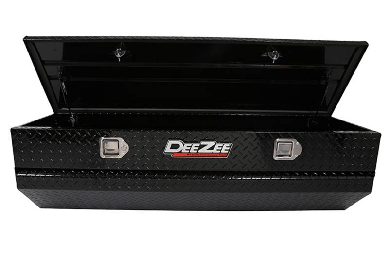 Dee Zee Tool Box - Red Label Chest. Constructed of heavy duty Brite-Tread aluminum. Black-Tread powder coat, provides a gloss black finish while it protects and prevents oxidation. Crown style lid with a full pan double-V stiffener for superior rigidity. Slanted front design to clear wheel well impact. Other features: lockable stainless steel paddle handles, dampened gas shocks, closed cell foam gasket, and self-adjusting strikers. Removable plastic tool tray to help keep small items organized.