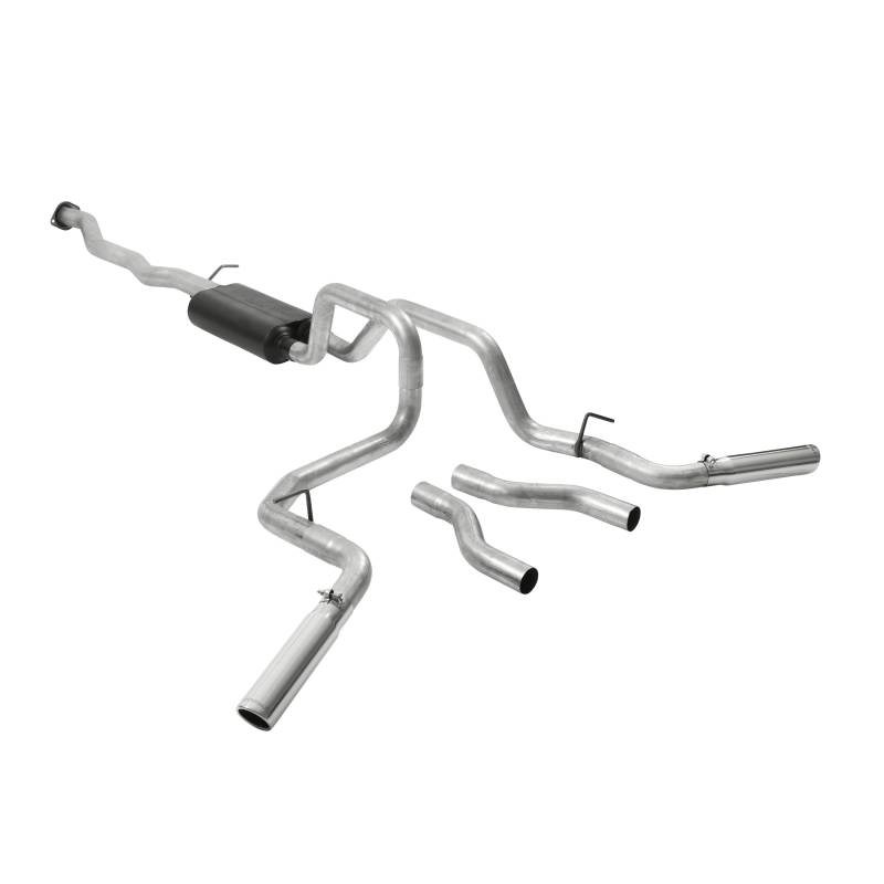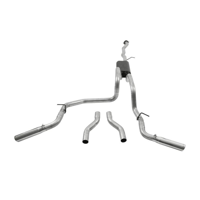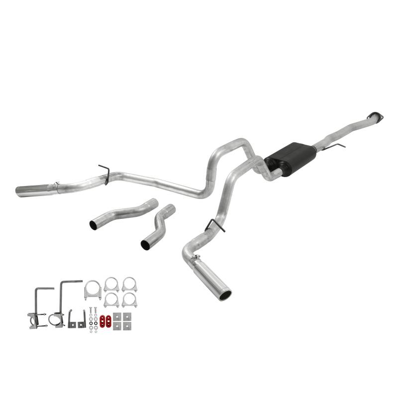For the person who is looking for an aluminized steel cat-back exhaust system with an aggressive exterior tone and moderate interior tone. The American Thunder® system is heavy 16-gauge mandrel-bent aluminized steel tubing for durability and maximum performance. Includes a Super 50™ Series performance muffler for that perfect blend of a deep aggressive exterior sound, with a moderate interior tone that won't drive you out of the cab when having a conversation. The dual 2.50-inch tailpipes clear the factory spare tire and give you two choices of exit locations. Straight out the back for that true dual look, or exiting out each side behind the rear wheels, which is ideal for towing. The system is finished off with a pair of 3.00-inch diameter highly polished 304 stainless steel tips embossed with the Flowmaster® name. Designed for an easy fit, these systems include all necessary parts, hardware and instructions for an easy installation you can do at home. Covered by our 3-year Limited Warranty. Notes: Fits Crew cab/short bed models.