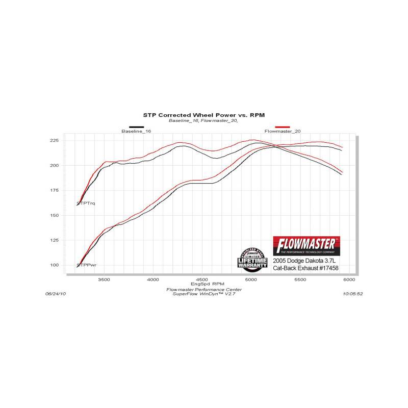 This Flowmaster Force II® cat-back exhaust system is custom designed for 2005-2010 Dodge Dakota trucks with V6 or V8 engines and is perfect for the person looking for a moderate sound level inside and outside of the truck, with all of the performance benefits that you would expect from Flowmaster®. This bolt-on emissions-legal system features a mandrel-bent aluminized steel inlet pipe flowing into a Super 50™ Series muffler for a moderate performance exterior sound. The single 3.00-inch aluminized steel mandrel-bent tailpipe is finished off with a large 3.50-inch polished embossed stainless steel tip. The exhaust system is covered by our 3-year Limited Warranty and includes all necessary parts, hardware and instructions for a quick and easy installation you can do at home. Note: Fits 2/4 wheel drive models and all wheelbases.