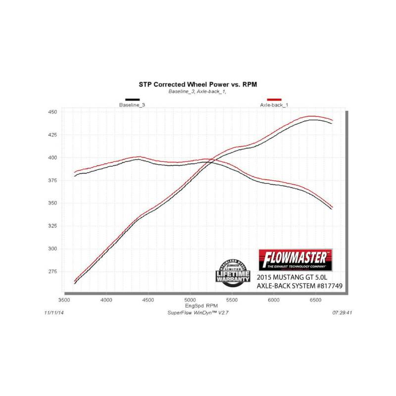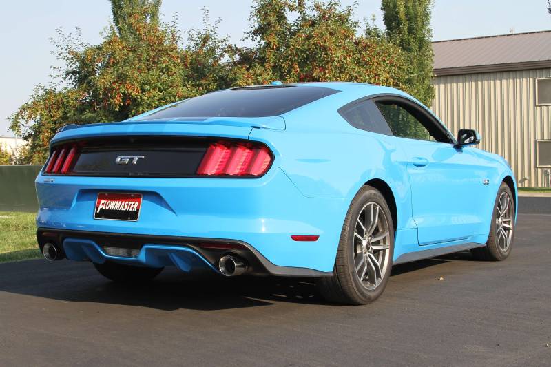 The Flowmaster® American Thunder® Axle-back exhaust system for the 2015-2017 Ford Mustang GT is perfect for the person looking for an aggressive sound level both inside and outside of the car, with all of the performance benefits that you would expect from Flowmaster. This bolt-on emissions-legal system is for cars with the 5.0L engine and features 3.00-inch mandrel-bent tubing flowing into a pair of Super 44™ Series performance mufflers with 3.00-inch tailpipes for maximum performance and a deep powerful sound. The system is constructed from 409 stainless steel and features large 4.00-inch polished stainless steel tips for a refined look. The system is covered by our Flowmaster Lifetime Limited Warranty and is designed for an easy fit and includes all necessary parts and hardware for installation. Note: This system fits coupes and convertibles.