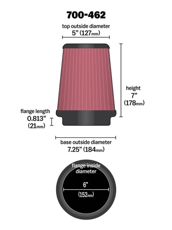 Universal Air Filter; Tapered Conical; Red SynthaFlow Oiled; Height 7 in.; Base OD 7.25 in.; Top OD 5 in.; Large End Dia. 7.25 in.; Flange ID 6 in.;
