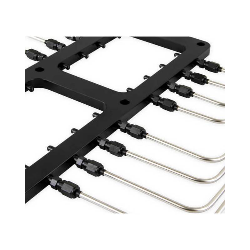 NOS offers supercharger injector plates and nitrous systems with black anodized polished aluminum plates, along with black nozzles, hardware, and bottles to give you a modern look to our popular 6-71/8-71 Supercharger nitrous lineup. Superchargers not only create more horsepower, but they also add unwanted engine heat. These NOS supercharger nitrous oxide systems can remedy that problem and increase power output at the same time. The nitrous is injected into the engine at -127 degrees F and mixes with the incoming air, reducing intake temperatures by up to 75 degrees F. The result is a denser intake charge and an increase in torque and horsepower of up to 30 to 40 percent over the entire power band! Plus, the nitrous can be injected at lower rpm--before the engine is at full boost--eliminating lag time and providing instantaneous power gains.