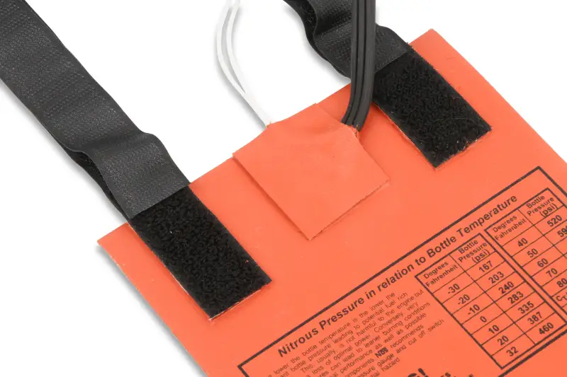 NOS systems are calibrated for optimum performance with a bottle pressure of 900- 950 psi. The pressure will change with temperature. Heater kits are thermostatically controlled (except P/N 14169NOS, which is pressure controlled) to keep the bottle at correct pressure. Kits available for the most popular-sized bottles, with both 12-volt and 110-volt heaters offered.