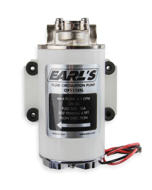 Earls electric oil pump is ideal for circulating the gear oil through an external oil cooler - for cooling the differential or manual transmission. This heavy duty pump features a metal housing & is self-priming w/ a flow rate of up to 2.1 gallons per minute. The compact design is durable and has a continuous duty rating (see temperature range shown below). This pump includes (2) -6 AN Male to BSPP adapter fittings. Ideal for use with Earl's UltraPro oil cooler along w/ AN hose & hose ends.