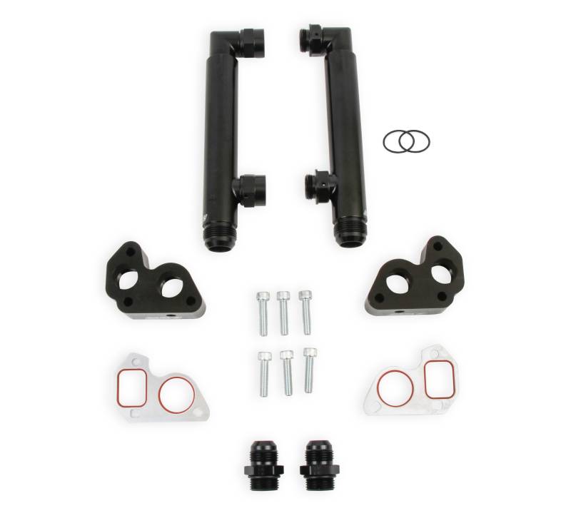 This plumbing kit simplifies the installation of a remote mounted electric water pump on the General Motors (GM) LS series engine. The special adjustable coolant cross-over tubes eliminate the Tees, Y-blocks & extra hose ends needed to make all the connections. The block adapters feature -12 AN O-ring ports for easy maintenance and a leak free seal. Kit includes (2) adjustable cross-over tubes, block adapters, (2) port fittings, and hardware. Billet aluminum construction w/ o-ring seals & black anodized finish.