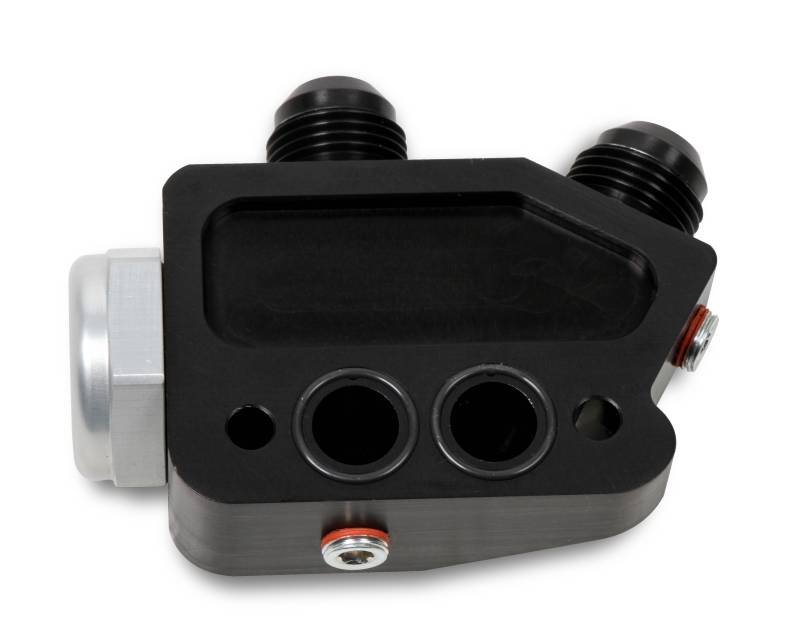 Earl's billet side mount oil cooler adapters are the slick way to add an oil cooler to your GM LS or Gen-V LT engine. The slim design of these adapters clear most headers and other components and feature -10 AN male connections. These adapters are black anodized and use O-Ring seals for a leak free installation.