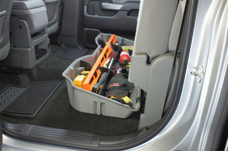 DÜHA 10303 Underseat Storage / Gun Case - Brown Whether you're a contractor, sports enthusiast, or anyone who values organized and secure storage, the DÜHA Underseat Storage System is the ultimate under seat truck storage solution for seamless truck storage integration. This innovative truck storage system maximizes space, enhances organization, and keeps your guns, tools, and gear safe and secure. Proudly roto-molded and Made in the USA, the DÜHA Underseat Storage System comes with a Limited Lifetime Warranty, reflecting the manufacturer's confidence in its quality and durability. The DÜHA Underseat Storage System features a durable, heavy-duty roto-molded construction which doesn't allow for flexing and bending. It also includes an easily removable two-piece gun rack/organizer, making it compliant with legal gun case regulations in most states. This allows you to safely store up to two guns, one of which can have a scope. You can also remove the dividers to store larger items. The DÜHA Underseat Storage System seamlessly integrates into your truck's interior, providing a factory-like appearance. It's make/model-specific fit guarantees optimal use of available space without taking up leg room. Elevate the organization and security of your truck's interior with this reliable and purpose-built under seat storage system. Fitment Notes: Minimal tools are required. Instructions are available with purchase or at our resources page. This DÜHA Underseat Storage System is custom designed to fit specific Y/M/M Crew Cab trucks and will NOT fit Double Cab models. Quick Installation: Simple installation with easy instructions Durable Construction: Heavy duty roto-molded construction doesn't allow for flexing and bending Seamless Integration: Exact fitment for your Y/M/M truck. Please double check part numbers Space Optimization: Better use of under seat space to fit guns, tools and gear Includes dividers/gun racks for customized organization