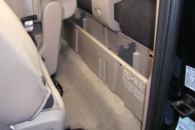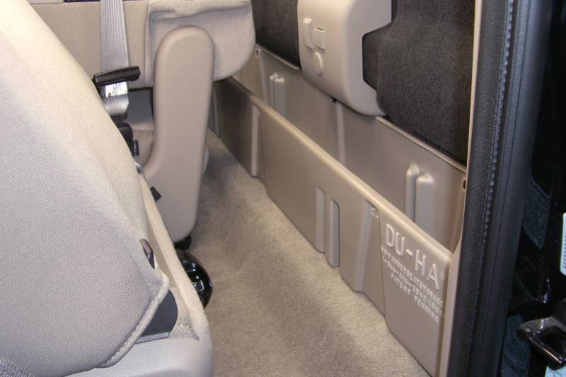 DÜHA 20054 Behind-the-Seat Storage / Gun Case - Black Whether you're a contractor, sports enthusiast, or anyone who values organized and secure storage, the DÜHA Behind-the-seat Storage System is the ultimate under seat truck storage solution for seamless truck storage integration. This innovative truck storage system maximizes space, enhances organization, and keeps your guns, tools, and gear safe and secure. Proudly roto-molded and Made in the USA, the DÜHA Behind-the-seat Storage System comes with a lifetime warranty, reflecting the manufacturer's confidence in its quality and durability. The DÜHA Behind-the-seat Storage System features a durable, heavy-duty roto-molded construction which doesn't allow for flexing and bending. It also includes an easily removable two-piece gun rack/organizer, making it compliant with legal gun case regulations in most states. This allows you to safely store up to two guns which both can be equipped with scopes. You can also remove the dividers to store larger items. The DÜHA Behind-the-seat Storage System seamlessly integrates into your truck's interior, providing a factory-like appearance. it's make/model-specific fit guarantees optimal use of available space without taking up leg room. Elevate the organization and security of your truck's interior with this reliable and purpose-built behind-the-seat storage system. Fitment Notes: Some trucks may need to temporarily remove jack. Instructions are available with purchase or at our resources page. Will NOT FIT with a factory subwoofer. This DÜHA Behind-the-seat Storage System is custom designed to fit'specific Y/M/M regular and crew cab trucks. For crew cab models with a 60/40 split bench seat, you can install both behind-the-seat and under seat storage (Part #20067). Quick Installation: Simple installation with easy instructions Durable Construction: Heavy duty roto-molded construction doesn't allow for flexing and bending Seamless Integration: Exact fitment for your Y/M/M truck. Please double check part numbers Space Optimization: Better use of unused space to fit guns, tools and gear Includes gun rack/organizers, so you can store your guns upright