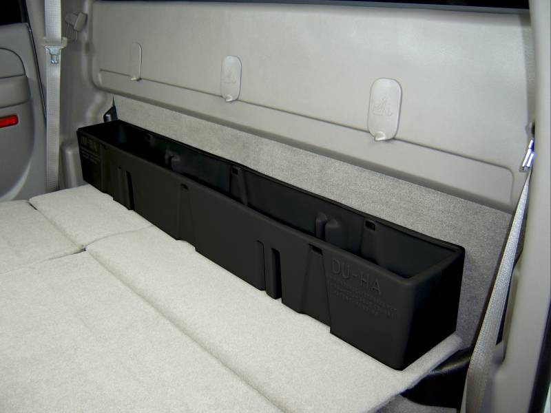 DÜHA 10013 Behind-the-Seat Storage / Gun Case - Black Whether you're a contractor, sports enthusiast, or anyone who values organized and secure storage, the DÜHA Underseat Storage System is the ultimate under seat truck storage solution for seamless truck storage integration. This innovative truck storage system maximizes space, enhances organization, and keeps your guns, tools, and gear safe and secure. Proudly roto-molded and Made in the USA, the DÜHA Underseat Storage System comes with a Limited Lifetime Warranty, reflecting the manufacturer's confidence in its quality and durability. The DÜHA Underseat Storage System features a durable, heavy-duty roto-molded construction which doesn't allow for flexing and bending. It also includes an easily removable two-piece gun rack/organizer, making it compliant with legal gun case regulations in most states. This allows you to safely store up to two guns, both of which can have a scope. You can also remove the dividers to store larger items. The DÜHA Underseat Storage System seamlessly integrates into your truck's interior, providing a factory-like appearance. It's make/model-specific fit guarantees optimal use of available space without taking up leg room. Elevate the organization and security of your truck's interior with this reliable and purpose-built under seat storage system. Fitment Notes: Minimal tools are required. Instructions are available with purchase or at our resources page. Fits 1500 HD, 2500, & 3500 models. Does NOT fit 1500 Light Duty Crew Cabs with 5' 8" short box. This DÜHA Underseat Storage System is custom designed to fit specific Y/M/M crew cab trucks and will NOT fit extended cab models. Quick Installation: Simple installation with easy instructions Durable Construction: Heavy duty roto-molded construction doesn't allow for flexing and bending Seamless Integration: Exact fitment for your Y/M/M truck. Please double check part numbers Space Optimization: Better use of under seat space to fit guns, tools and gear Includes dividers/gun racks for customized organization