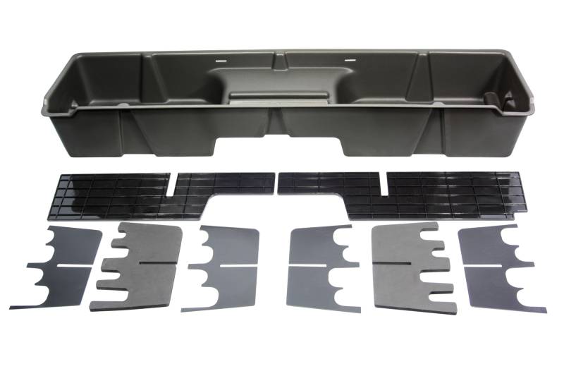 DÜHA 10001 Underseat Storage / Gun Case - Dark Gray Whether you're a contractor, sports enthusiast, or anyone who values organized and secure storage, the DÜHA Underseat Storage System is the ultimate under seat truck storage solution for seamless truck storage integration. This innovative truck storage system maximizes space, enhances organization, and keeps your guns, tools, and gear safe and secure. Proudly roto-molded and Made in the USA, the DÜHA Underseat Storage System comes with a Limited Lifetime Warranty, reflecting the manufacturer's confidence in its quality and durability. The DÜHA Underseat Storage System features a durable, heavy-duty roto-molded construction which doesn't allow for flexing and bending. It also includes an easily removable two-piece gun rack/organizer, making it compliant with legal gun case regulations in most states. This allows you to safely store up to four guns, two of which can have a scope. You can also remove the dividers to store larger items. The DÜHA Underseat Storage System seamlessly integrates into your truck's interior, providing a factory-like appearance. It's make/model-specific fit guarantees optimal use of available space without taking up leg room. Elevate the organization and security of your truck's interior with this reliable and purpose-built under seat storage system. Fitment Notes: Minimal tools are required. Instructions are available with purchase or at our resources page. Fits 1/2 ton, 3/4 ton, and 1 ton models. Does NOT fit 2006-2007 (Classic) 5' 8" extra short box model. This DÜHA Underseat Storage System is custom designed to fit specific Y/M/M extended cab trucks and will NOT fit Crew Cab models. Optional lock kit is also available for this model (Part # 80090). Quick Installation: Simple installation with easy instructions Durable Construction: Heavy duty roto-molded construction doesn't allow for flexing and bending Seamless Integration: Exact fitment for your Y/M/M truck. Please double check part numbers Space Optimization: Better use of under seat space to fit guns, tools and gear Includes dividers/gun racks for customized organization