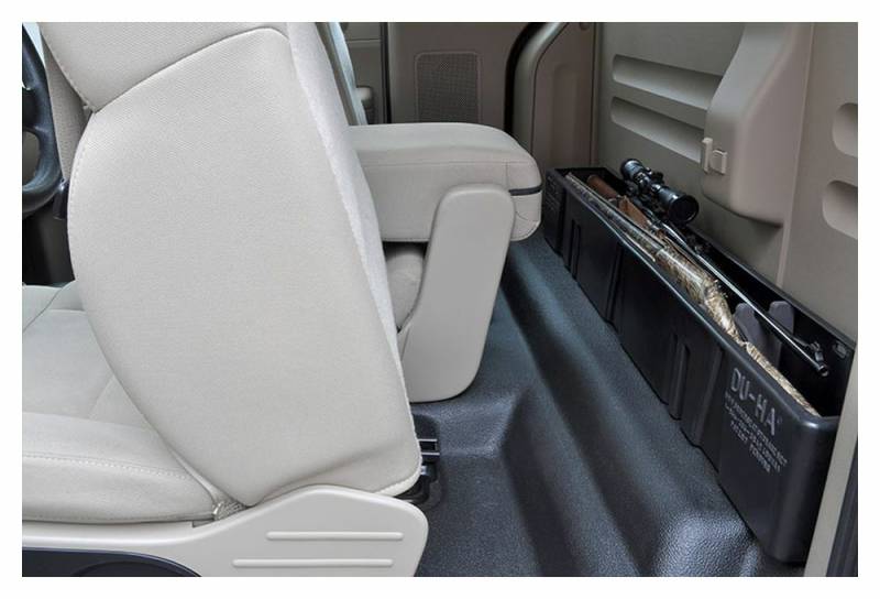 DÜHA 20105 Behind-the-Seat Storage / Gun Case - Black Whether you're a contractor, sports enthusiast, or anyone who values organized and secure storage, the DÜHA Behind-the-seat Storage System is the ultimate under seat truck storage solution for seamless truck storage integration. This innovative truck storage system maximizes space, enhances organization, and keeps your guns, tools, and gear safe and secure. Proudly roto-molded and Made in the USA, the DÜHA Behind-the-seat Storage System comes with a lifetime warranty, reflecting the manufacturer's confidence in its quality and durability. The DÜHA Behind-the-seat Storage System features a durable, heavy-duty roto-molded construction which doesn't allow for flexing and bending. It also includes an easily removable two-piece gun rack/organizer, making it compliant with legal gun case regulations in most states. This allows you to safely store up to two guns which both can be equipped with scopes. You can also remove the dividers to store larger items. The DÜHA Behind-the-seat Storage System seamlessly integrates into your truck's interior, providing a factory-like appearance. it's make/model-specific fit guarantees optimal use of available space without taking up leg room. Elevate the organization and security of your truck's interior with this reliable and purpose-built behind-the-seat storage system. Fitment Notes: Instructions are available with purchase or at our resources page. This DÜHA Behind-the-seat Storage System is custom designed to fit'specific Y/M/M regular cab trucks and will not fit'superCab and SuperCrew trucks. Quick Installation: Simple installation with easy instructions Durable Construction: Heavy duty roto-molded construction doesn't allow for flexing and bending Seamless Integration: Exact fitment for your Y/M/M truck. Please double check part numbers Space Optimization: Better use of unused space to fit guns, tools and gear Includes dividers/gun racks for customized organization