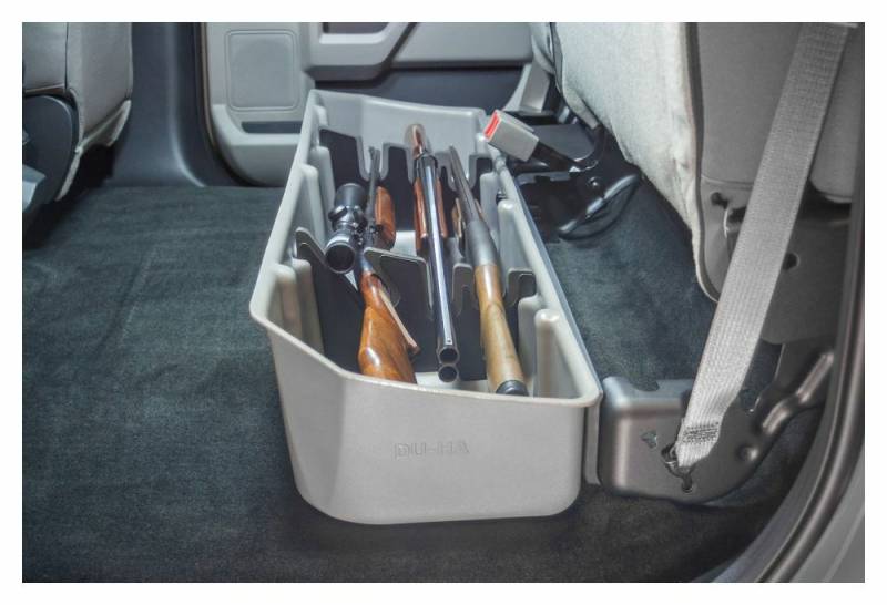 DÜHA 20112 Underseat Storage / Gun Case - Tan Whether you're a contractor, sports enthusiast, or anyone who values organized and secure storage, the DÜHA Underseat Storage System is the ultimate under seat truck storage solution for seamless truck storage integration. This innovative truck storage system is stronger than factory dividers, maximizes space, enhances organization, and keeps your guns, tools, and gear safe and secure. Proudly roto-molded and Made in the USA, the DÜHA Underseat Storage System comes with a Limited Lifetime Warranty, reflecting the manufacturer's confidence in its quality and durability. The DÜHA Underseat Storage System features a durable, heavy-duty roto-molded construction which doesn't allow for flexing and bending. It also includes an easily removable two-piece gun rack/organizer, making it compliant with legal gun case regulations in most states. This allows you to safely store up to three guns, one of which can have a scope. You can also remove the dividers to store larger items. The DÜHA Underseat Storage System seamlessly integrates into your truck's interior, providing a factory-like appearance. It's make/model-specific fit guarantees optimal use of available space without taking up leg room. Elevate the organization and security of your truck's interior with this reliable and purpose-built under seat storage system. Fitment Notes: Factory storage tray will need to be removed. Minimal tools are required. Instructions are available with purchase or at our resources page. This DÜHA Underseat Storage System is custom designed to fit specific Y/M/M SuperCrew trucks and will NOT fit SuperCab models. Quick Installation: Simple installation with easy instructions Durable Construction: Much more durable than factory dividers. Heavy duty roto-molded construction doesn't allow for flexing and bending Seamless Integration: Exact fitment for your Y/M/M truck. Please double check part numbers Space Optimization: Better use of under seat space to fit guns, tools and gear Includes dividers/gun racks for customized organization