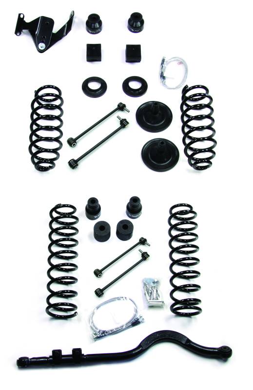 The TeraFlex JK 4dr: 4” Coil Spring Lift Kit w/ Track Bar includes just the basic lift components only and doesn’t have the drivability of a full suspension system. Requires longer preset or adjustable control arms to correct suspension geometry. An adjustable rear track bar is recommended.