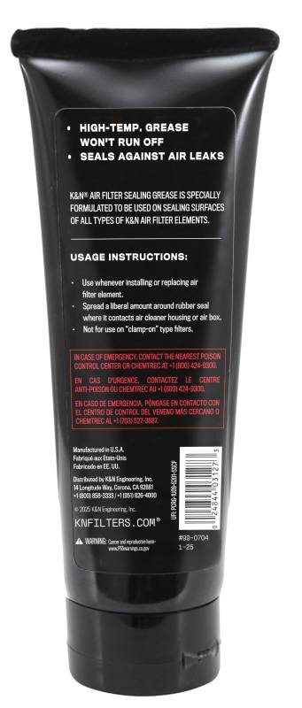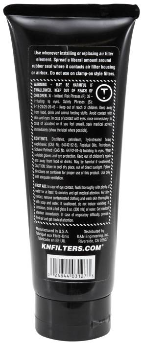 Sealing Grease - 6oz K&N Sealing Grease 99-0704 provides an airtight fit around sealing surfaces on all types of air filter elements. It resists heat and will not melt or run off. K&N Sealing Grease is designed to ensure the filter stays sealed in rugged environments. It is not to be used on clamp-on filter elements. K&N Sealing Grease 99-0704 comes in a 6 ounce tube.