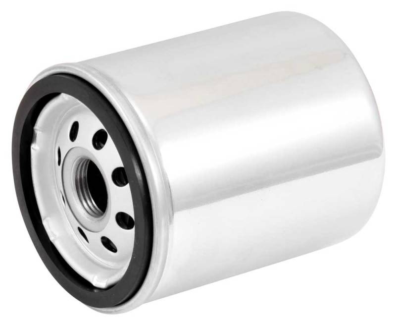 Oil Filter K&N powersports chrome canister oil filters contain a modern synthetic filter media, designed for ultimate flow with less pressure drop, yet engineered for outstanding filtration. K&N powersports 'spin-on' oil filters feature a heavy-duty, chrome-plated metal can. Most of these have a 17 mm nut affixed onto the end that allows for easy removal. The 17 mm nut is crossed-drilled so racers can safety wire the filter to their bike.