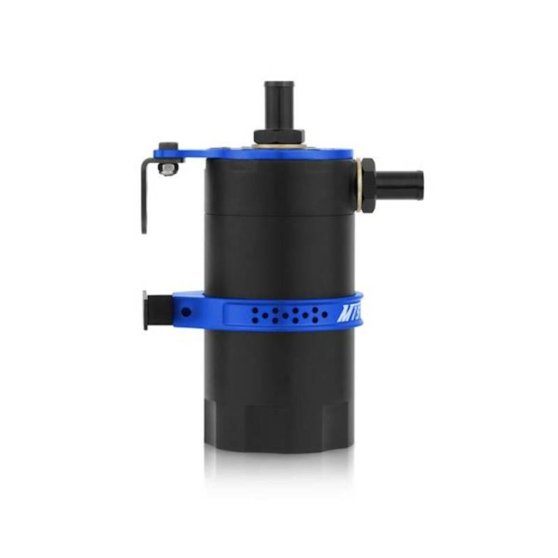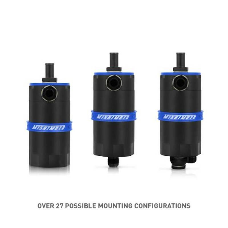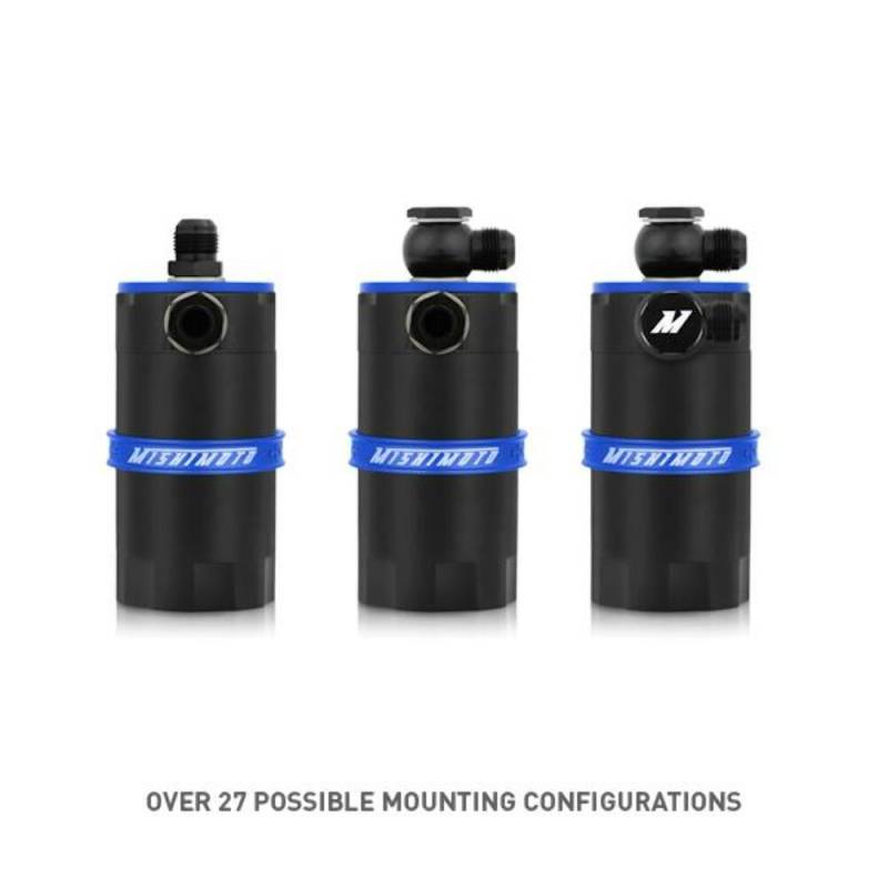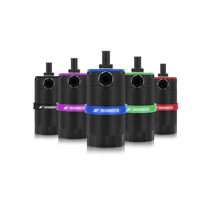 Baffled Oil Catch Can, Blue Mishimoto is proud to announce the release of our Baffled Oil Catch Can.With over a year of research and development time, Mishimoto has created the most effective oil catch can on the market.The Mishimoto Baffled Oil Catch can was designed to separate oil particles from the PCV air that would normally have just been routed back to your intake.Custom grooves in the catch can's inlet turbulates the air longer and ensures all the oil sinks to the bottom of the can, leaving nothing but clean air to pass through the 40 micron bronze filter to the intake.An internal baffle keeps the collected oil from splashing around under race conditions.The 100-percent billet, 6061 aluminum can accepts inAN fittings at the intlet, outlet, and drain area allowing over 25 possible configurations.For maximum fitment options, the top cog mounting setup allows the can to be mounted from multiple angles.To make maintenance easy, the drain plug can be removed to allow for inAN return to the oil pain.The can is also 100-percent washable, unlike many other cans that require you to replace your filtration system.The Mishimoto Baffled Oil Catch Can is available in a variety of colors as well, so it will be sure to match your style and taste! 40-micron bronze filter blocks oil from depositing in ventilation system Special engineered inlet pattern turbulates air longer, allowing oil to condense Internal baffle ensures no oil escapes during high-speed cornering