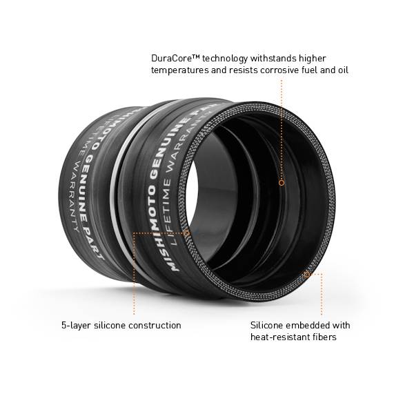 Factory-Fit Boot Kit, fits Dodge 5.9L Cummins 2003-2007 Mishimoto has released a direct-fIt'silicone boot kit with DuraCore technology designed specifically for the 5.9L Dodge Cummins.The inline-6 Cummins is well known for its smooth power delivery, which can be disrupted suddenly by a blown intercooler boot.Keep your truck on the road by upgrading to the Mishimoto factory-fit DuraCore boot kit.Mishimoto DuraCore technology is the synthetic material that comprises the innermost layer of all Mishimoto silicone diesel boots.Compared to normal silicone, DuraCore provides superior resistance to heat, pressure, fuel, and oil.This effectively increases the life of our boots by preventing leaks and blowouts.To add even more reliability this kit includes Mishimoto constant-tension T-bolt clamps for accurate and consistent holding power.The Mishimoto boot kit retains factory fitment for ease of installation and is protected by the Mishimoto lifetime warranty. Five layers of heat resistant fiber for maximum durability and blowout prevention DuraCore technology provides superior resistance to heat, pressure, fuel, and oil Includes high-quality constant-tension T-bolt clamps
