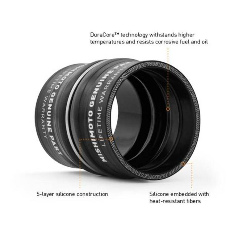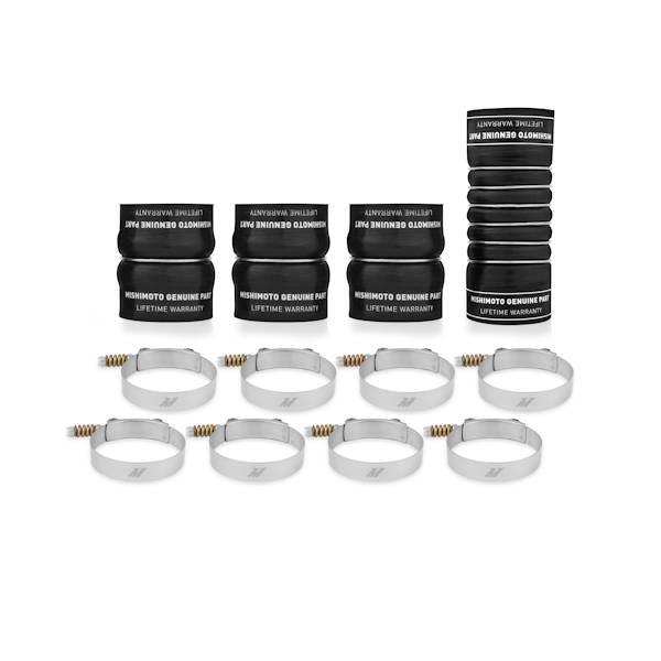 Factory-Fit Boot Kit, Black, fits Dodge 5.9L Cummins 2003-2007 Mishimoto has released a direct-fIt'silicone boot kit with DuraCore technology designed specifically for the 5.9L Dodge Cummins.The inline-6 Cummins is well known for its smooth power delivery, which can be disrupted suddenly by a blown intercooler boot.Keep your truck on the road by upgrading to the Mishimoto factory-fit DuraCore boot kit. Mishimoto DuraCore technology is the synthetic material that comprises the innermost layer of all Mishimoto silicone diesel boots. Compared to normal silicone, DuraCore provides superior resistance to heat, pressure, fuel, and oil.This effectively increases the life of our boots by preventing leaks and blowouts.To add even more reliability this kit includes Mishimoto constant-tension T-bolt clamps for accurate and consistent holding power.The Mishimoto boot kit retains factory fitment for ease of installation and is protected by the Mishimoto lifetime warranty. Five layers of heat resistant fiber for maximum durability and blowout prevention DuraCore technology provides superior resistance to heat, pressure, fuel, and oil Includes high-quality constant-tension T-bolt clamps