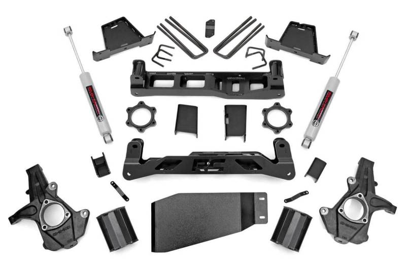 Go Big with Confidence: Rough Country's 7.5-inch Suspension Lift Kit for your Chevy Silverado 1500/GMC Sierra 1500 delivers towering ride height, aggressive stance, and the clearance to run 35-inch tires all while using your factory 20-inch wheels. No wheel upgrades needed to dominate the trails.Clean, Level Stance from Front to Rear: Say goodbye to factory rake. This lift kit achieves a balanced, level profile that looks just as tough as it performs, giving your truck a commanding presence on and off the road.Engineered for Ground-Clearing Performance: Our signature high-clearance crossmembers feature a low-profile design with the iconic "RC" logo, giving you maximum ground clearance and trail-readiness. A heavy-duty lower skid plate and precision-engineered sway-bar and differential drop brackets further enhance durability and protection.Install Made Easy No Cutting Required: Designed with convenience in mind, this kit requires zero drivetrain, exhaust, or differential modifications. Even better, there's no need to disassemble your struts making installation faster and smoother than traditional lift systems.Durability You Can Depend On: All components are precision laser-cut using advanced CAD technology, ensuring an exact fit and rock-solid durability. The included rear 6.5-inch heavy-duty fabricated lift blocks are stronger and more reliable than standard cast options and feature anti-wrap technology to preserve your factory ride quality.Customize Your Ride: This kit is fully compatible with your choice of Rough Country shock and strut options from our value-packed, nitrogen-charged N3s to the high-performance Vertex reservoir series. Get the ride feel and performance that matches your driving style.