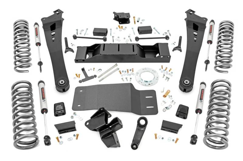 Compliment your RAM 2500's aggressive, good looks with Rough Country's new 5-inch Lift Kit with lifted coil springs. New model RAM Trucks come with a wealth of impressive features right from the factory. Rough Country's new 5-inch kit was engineered to retain these impressive factory specs while bumping up performance and durability where it's needed most. The result is a lifted beast with a mean profile and lush ride-quality that'll make other RAM owners wonder where you got yours from!\ When changing a vehicle's suspension, the key to preserving ride quality is in keeping the geometry of all suspension components as close to their factory angles as possible. Rough Country's new 5-inch Suspension kit features a set of ultra-durable Radius Arms, precision fit to bolt right into the factory mounts for an easier install and a more factory-like angle. These beefy, upgraded Radius Arms also feature a durable, durable rubber bushings for maximum vibration absorption. This kit also includes a skid plate and a set of front and rear dual-rate lifted coil springs for unparalleled ride quality from your lifted Dodge Ram. The Dual Rate coil srpings combine a relatively low initial spring rate, designed to absorb minor undulations and increase grip with a precise transition point and transition range to a secondary higher spring rate to improve handling and driveability.