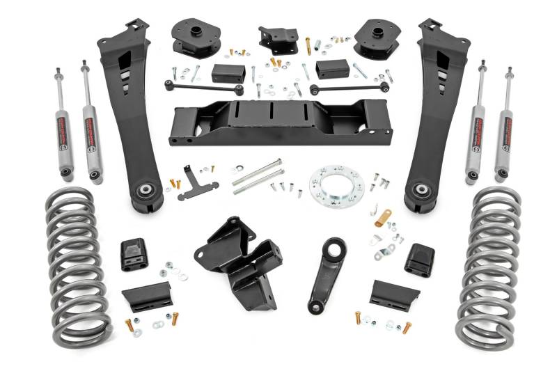 Compliment your RAM 2500's aggressive, good looks with Rough Country's new 5-inch Lift Kit with lifted coil springs. New model RAM Trucks come with a wealth of impressive features right from the factory. Rough Country's new 5-inch kit was engineered to retain these impressive factory specs while bumping up performance and durability where it's needed most. The result is a lifted beast with a mean profile and lush ride-quality that'll make other RAM owners wonder where you got yours from!\ When changing a vehicle's suspension, the key to preserving ride quality is in keeping the geometry of all suspension components as close to their factory angles as possible. Rough Country's new 5-inch Suspension kit features a set of ultra-durable Radius Arms, precision fit to bolt right into the factory mounts for an easier install and a more factory-like angle. These beefy, upgraded Radius Arms also feature a durable, durable rubber bushings for maximum vibration absorption. This kit also includes a skid plate and a set of front, lifted coil springs for unparalleled ride quality from your lifted Dodge Ram.
