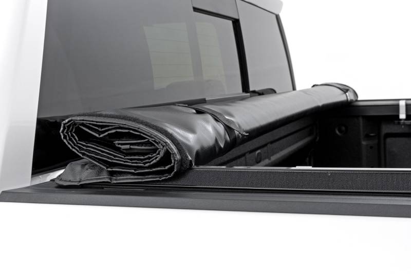 All-Weather Bed Protection: Rough Country's Soft Roll-Up Bed Cover delivers reliable protection against the elements while preserving full bed functionality. Constructed from high-quality, marine-grade vinyl with a sleek matte black finish, this durable cover features heavy-duty hook-and-loop side seals and tight front and rear barriers to shield your cargo from rain, dust, and debris.Streamlined Low-Profile Design: Sitting just 1-1/8" above the bed, this top-mount cover blends seamlessly with your truck's lines for a clean, stylish look. The corrosion-resistant, black powder-coated aluminum frame offers long-lasting strength without sacrificing style or aerodynamics.Fast and Easy Bed Access: The roll-up design and spring-latch closure system make opening and closing the cover a breeze. A single cable pull lets you release the latch quickly, giving you fast access to your full bed whenever you need it. Whether you're hauling gear or unloading tools, convenience comes standard. Effortless Installation: No drilling required - this cover installs in just 20 minutes using the included bracket system and tools. It mounts securely to your factory bed rails for a snug, hassle-free fit you can count on.Protected by a 5-Year Warranty: Rough Country backs this Soft Roll-Up Bed Cover with a 5-Year Replacement Warranty, protecting against structural and workmanship defects so you can hit the road with total confidence.