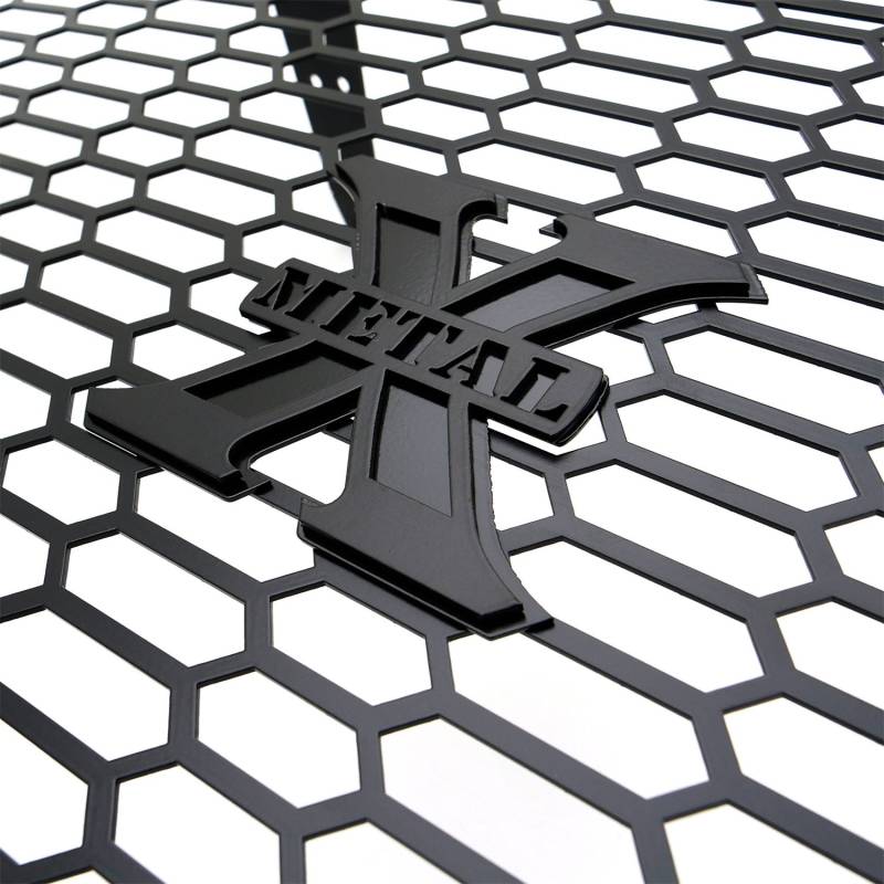 Stealth Laser X Grilles add a modern update to the traditional X-Metal Grilles with the upgraded laser cut steel 1-piece construction and blacked out design. The main grille design features a unique repeating "Honey Comb" pattern and the black X-Metal studs and badging are prominently displayed on the black powdercoated mild steel. Laser X Grilles are available with chrome studs as well (Laser X Series). Our uncompromising quality begins with advanced 3D CAD supported engineering and design. All our products undergo rigorous testing for fit, finish, drivability and durability. Each part starts with a custom jig using laser cut materials, precision TIG welding and meticulous assembly and quality control. This dedication of American craftsmanship shows in every product that leaves our facility in California. All ourblack powdercoatedgrilles go through amulti-stage process, first theyare sandblasted to prepare the surface for our epoxy primer base coat. Second, they are cleaned to remove contaminants from the sandblast process. Then an epoxy primer base coat is applied and cured to seal the entire surface, finally the color top coat is applied over the primer and cured to provide long lastingprotection anda high-quality OEM finish.