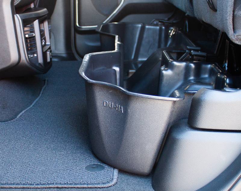 DÜHA 30106 Underseat Storage/Gun Case - Brown Whether you're a contractor, sports enthusiast, or anyone who values organized and secure storage, the DÜHA Underseat Storage System is the ultimate under seat truck storage solution for seamless truck storage integration. This innovative truck storage system is stronger than factory dividers, maximizes space, enhances organization, and keeps your guns, tools, and gear safe and secure. Proudly roto-molded and Made in the USA, the DÜHA Underseat Storage System comes with a lifetime warranty, reflecting the manufacturer's confidence in its quality and durability. The DÜHA Underseat Storage System features a durable, heavy-duty roto-molded construction which doesn't allow for flexing and bending. It also includes an easily removable two-piece gun rack/organizer, making it compliant with legal gun case regulations in most states. This allows you to safely store up to two guns without scopes. You can also remove the dividers to store larger items. The DÜHA Underseat Storage System seamlessly integrates into your truck's interior, providing a factory-like appearance. it's make/model-specific fit guarantees optimal use of available space without taking up leg room. Elevate the organization and security of your truck's interior with this reliable and purpose-built under seat storage system. Fitment Notes: Minimal tools are required. Instructions are available with purchase or at our resources page. This DÜHA Underseat Storage System is custom designed to fit'specific Y/M/M quad cab trucks and will NOT fit crew cab models. How can I tell if I have a Crew Cab or Quad Cab? Crew Cab has larger back door - 42" wide, Quad Cab has smaller back door - 31.5" wide Quick Installation: Simple installation with easy instructions Durable Construction: Much more durable than factory dividers. Heavy duty roto-molded construction doesn't allow for flexing and bending Seamless Integration: Exact fitment for your Y/M/M truck. Please double check part numbers Space Optimization: Better use of under seat space to fit guns, tools and gear Includes dividers/gun racks for customized organization