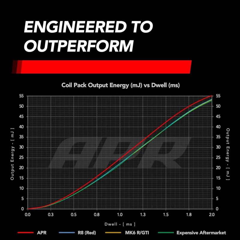 Refresh your ignition system in one shot with APR Ignition Coils and pair with APR Iridium Pro Spark Plugs engineered to work together for a stronger, more consistent spark. Each is a direct-fit upgrade designed to support smoother idle, sharper throttle response, and reliable performance under heat and load—whether you’re stock or running higher boost and power upgrades.\nUP TO 10% MORE ENERGY OUTPUT THAN STOCK: Unlock max engine efficiency with top of the line engineering. APR coils produce a more consistent spark which can mean increased engine power, improved throttle response, quicker acceleration, & smoother idling.\nDURABILITY MEETS ENGINEERING: No more sluggish acceleration or misfires. From premium materials to rigorous testing, each coil is engineered for consistency, durability, and more efficient power delivery–all packaged in a sleek, performance-grade casing.\nDIRECT PLUG AND PLAY: Just a few steps to your instant upgrade. Visually confirm 4-prong fit, then swap out existing OEM coils for plug and play ease.\nCOMPATIBILITY: APR MS100208 Coil (Red) fits a variety of Audi, Lamborghini, Porsche and VW vehicles - VW Group PQ35 / PQ45 platforms. Always confirm visually before installation to ensure proper fit.\nCHECK YOUR MAKE AND MODEL: Audi A3 A4 A5 A6 A7 A8 Allroad Q3 Q5 Q7 R8 RS4 RS5 S4 S5 S6 S8 SQ5 TT TTRS & TTS. Lamborghini Gallardo Huracan & Aventador. Porsche Cayenne & Panamera. VW Arteon Atlas Beetle CC Eos Golf Golf R GTI Jetta Passat Tiguan & Touareg\nREPLACEMENT FOR STOCK OEM: Direct replacement for OEM stock part numbers 06D905115A/C/D/F/G/K, 06E905115A/B/C/D/E/F/G, 06F905115C/E/F, 06H905611, 06H905115/B, 06L905110B, 07K905715D/E/F/G.\nTRUSTED IN THE U.S. FOR OVER 25 YEARS: Founded in 1997, APR is Headquartered in Opelika, Alabama and has become a global leader in quality and reliable performance aftermarket products for Volkswagen, Audi, Porsche, and other vehicles.\nIncludes: One Ignition Coil (MS100208)