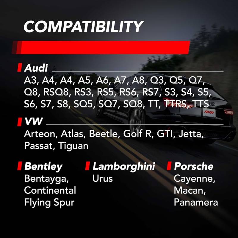 Refresh your ignition system in one shot with APR Ignition Coils and pair with APR Iridium Pro Spark Plugs engineered to work together for a stronger, more consistent spark. Each is a direct-fit upgrade designed to support smoother idle, sharper throttle response, and reliable performance under heat and load—whether you’re stock or running higher boost and power upgrades.\nUP TO 14% MORE ENERGY OUTPUT THAN STOCK: Unlock max engine efficiency with top of the line engineering. APR coils produce a more consistent spark which can mean increased engine power, improved throttle response, quicker acceleration, & smoother idling.\nDURABILITY MEETS ENGINEERING: No more sluggish acceleration or misfires. From premium materials to rigorous testing, each coil is engineered for consistency, durability, and more efficient power delivery–all packaged in a sleek, performance-grade casing.\nDIRECT PLUG AND PLAY: Just a few steps to your instant upgrade. Visually confirm 4-prong fit, then swap out existing OEM coils for plug and play ease.\nCOMPATIBILITY: APR MS100192 Coil (Red) fits a wide range of Audi, VW, Lamborghini, Porsche and Bentley vehicles. Always confirm visually before installation to ensure proper fit.\nFITS MODELS: Audi A3 A4 A4 A5 A6 A7 A8 Q3 Q5 Q7 Q8 RSQ8 RS3 RS5 RS6 RS7 S3 S4 S5 S6 S7 S8 SQ5 SQ7 SQ8 TT TTRS TTS, VW Arteon Atlas Beetle Golf R GTI Jetta Passat Tiguan, Bentley Bentayga Continental Flying Spur, Lambo Urus, Porsche Cayenne Macan Panamera\nREPLACEMENT FOR STOCK OEM: Direct replacement for OEM stock part numbers 06H905110G, 06H905110L, 06H905110P, 06K905601B, 06K905601L, 06K905601M, 06K905611C, 06M905606F, 06Q905601, 06Q905601E, 079905110R, 0P2905601, 0P2905601A, 9A790560100, 9A790560101\nTRUSTED IN THE U.S. FOR OVER 25 YEARS: Founded in 1997, APR is Headquartered in Opelika, Alabama and has become a global leader in quality and reliable performance aftermarket products for Volkswagen, Audi, Porsche, and other vehicles.\nIncludes: One Ignition Coil (MS100204)