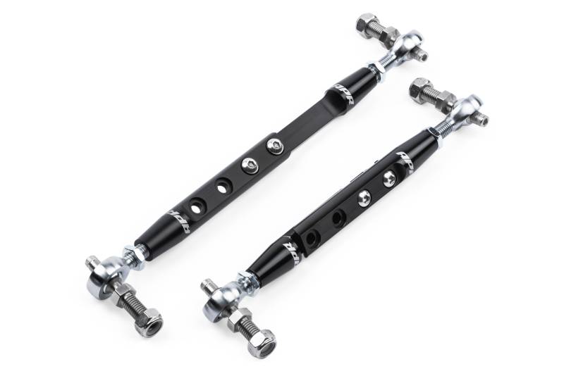 APR's Roll-Control Front Stabilizer Bar End Links improve handling and response through the use of replaceable and swappable spherical bearings, intended for race use. The end links offer a great range of adjustability in both connection geometry and height, allowing elimination of pre-loading and correction of stabilizer bar geometry. This is a necessary upgrade when altering the factory suspension components to allow correct operation and maximum performance.