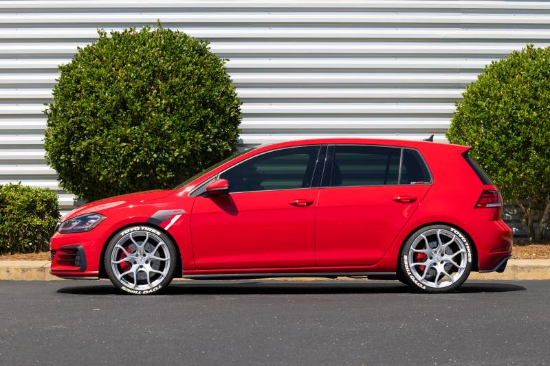 APR Roll-Control Lowering Springs greatly improve the looks and handling of your Volkswagen MK7 / MK7.5 GTI and Golf R without greatly sacrificing comfort or your wallet! Designed for use with DCC or Non-DCC dampers, our performance lowering springs are a direct plug-and-play upgrade that offer a lower center of gravity and increased spring rates to reduce body roll.\nMany lowering springs on the market today simply lower your vehicle and give a false sense of improvement by feeling overly stiff. We took a different approach with our design. We extensively track and street tested several iterations to deliver a system that not only makes your GTI and Golf R look great, but does so while delivering a comfortable experience that doesn't constantly compress and ride on the bump stops or crash and bottom out the dampers. Through a proper ride height configuration, we're able to greatly increase spring rates for improved handling, but do so without leaving the ride harsh, bouncy, and uncomfortable. Your GTI will be planted with a minimal impact on comfort. It's a system you'll love the second you're behind the wheel!\nThese springs were designed in house and manufactured in the USA using a premium high tensile chrome silicon steel for excellent resilience against sagging and failure for years to come. Each spring comes powder coated in our signature red color, further protecting the spring from the elements. The front and rear springs are a dual rate spring that will operate as a single rate, linear spring, under normal loaded driving situations. All center of wheel to fender (CF) measurements were recorded on our in-house US Spec 2017 MK7 GTI (Non-DCC), US Spec 2018 MK7.5 GTI (DCC), and US Spec 2018 MK7.5 Golf R (DCC) test vehicles and may vary slightly from vehicle to vehicle. Lastly, while this system was designed specifically for the MK7 / MK7.5 GTI, it will fit other similar platform vehicles.\nSpecifications:\nUS 2018 MK7.5 GTI (DCC) Front:\n362 mm (OEM) vs 340 mm (APR) or a 22 mm reduction in CF Height\n215 lbs/in (OEM) vs 323 lbs/in (APR) or a 50% increase in Spring Rate\nUS 2018 MK7.5 GTI (DCC) Rear:\n370 mm (OEM) vs 333 mm (APR) or a 37 mm reduction in CF Height\n226 lbs/in (OEM) vs 362 lbs/in (APR) or a 60% increase in Spring Rate\nUS 2017 MK7 GTI (Non-DCC) Front:\n368 mm (OEM) vs 350 mm (APR) or a 18 mm reduction in CF Height\n184 lbs/in (OEM) vs 323 lbs/in (APR) or a 76% increase in Spring Rate\nUS 2017 MK7 GTI (Non-DCC) Rear:\n367 mm (OEM) vs 335 mm (APR) or a 32 mm reduction in CF Height\n250 lbs/in (OEM) vs 362 lbs/in (APR) or a 45% increase in Spring Rate\nUS 2019 MK7.5 Golf R (DCC) Front:\n346 mm (OEM) vs 341 mm (APR) or a 5 mm reduction in CF Height\n216 lbs/in (OEM) vs 323 lbs/in (APR) or a 50% increase in Spring Rate\nUS 2019 MK7.5 Golf R (DCC) Rear:\n356 mm (OEM) vs 333 mm (APR) or a 22 mm reduction in CF Height\n245 lbs/in (OEM) vs 362 lbs/in (APR) or a 48% increase in Spring Rate