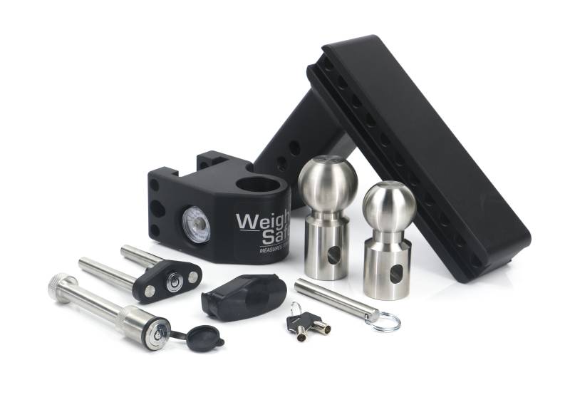 Steel Weigh Safe Adjustable Drop Hitch - 8" Drop & 2.5" Shank w/Hitch Pin Lock The Steel Weigh Safe Adjustable Ball Mount provides “Towing Peace of Mind” with a high-grade steel construction and stainless steel tow balls. This hitch boasts some of the highest ratings in the industry and can be used in both the drop and rise positions. Safe Towing: Built-in hydraulic scale measures tongue weight to ensure 10-15% of the gross trailer weight is on the tow ball. This prevents trailer sway and jackknifing to promote "Towing Peace of Mind." 8" Adjustable Ball Mount: 8” drop & 9" rise (hitch can be used in the drop or rise position), adjusts in 1" increments so you get the perfect position for any trailer height Industry Leading Weight Ratings: rated for 22,000 lbs. max GTW and 1,500 lbs. MTW in the drop or rise position Stowability: Can be rotated under the vehicle and stored while not in use Keyed-Alike Locks: Includes a dual-pin lock and hitch pin lock keyed with the same key code - one key for all locks