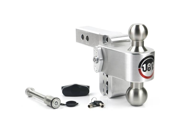 180 Hitch - Drop Hitch w/SS Combo Ball - 4" Drop for 2" Shank w/Hitch Pin The 180 Hitch by Weigh Safe is the definition of adaptability and ease. Made of aircraft-grade 6061 aluminum, it's available in stainless steel or chrome-plated steel combo tow balls! This hitch can be used in both the drop and rise positions! Built-in gauge not available with this 180 Hitch model. Stainless Steel Combo Ball: Quickly switch from a 2-5/16" tow ball to a 2" tow ball by flipping the slider 180 degrees 4" Adjustable Ball Mount: 4” drop & 5" rise (hitch can be used in the drop or rise position), adjusts in 1" increments so you get the perfect position for any trailer height Industry Leading Weight Ratings: rated for 12,500 lbs. max GTW and 1,500 lbs. MTW in the drop or rise position Stowability: Can be rotated under the vehicle and stored while not in use. Excludes 3" shank sizes Keyed-Alike Locks: Includes a dual-pin lock and hitch pin lock keyed with the same key code - one key for all locks