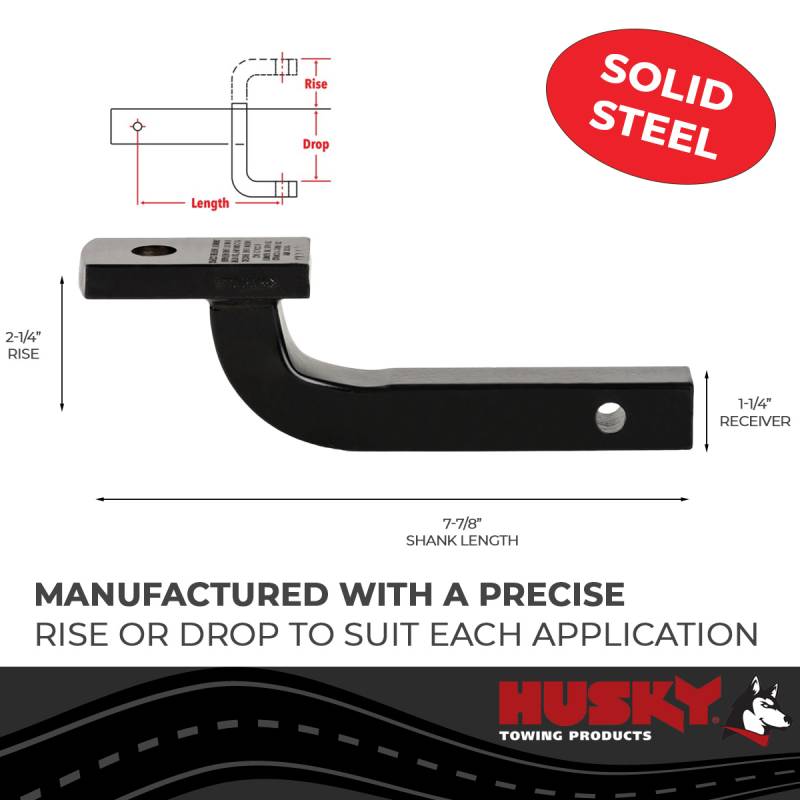1-1/4" Recvr 3500 LB Cap 2-7/8" Drop/2-1/4" Rise 7-7/8" Shank Length The best way to even out a load is to select the best fitting ball mount. Ball mounts vary by weight rating, shaft length, and rise or drop measurements. Husky?s Class I and II Ball Mounts are manufactured with a precise rise or drop to suit each of the a Manufactured With A Precise Rise Or Drop To Suit Each Of The Applications Limited Lifetime Warranty