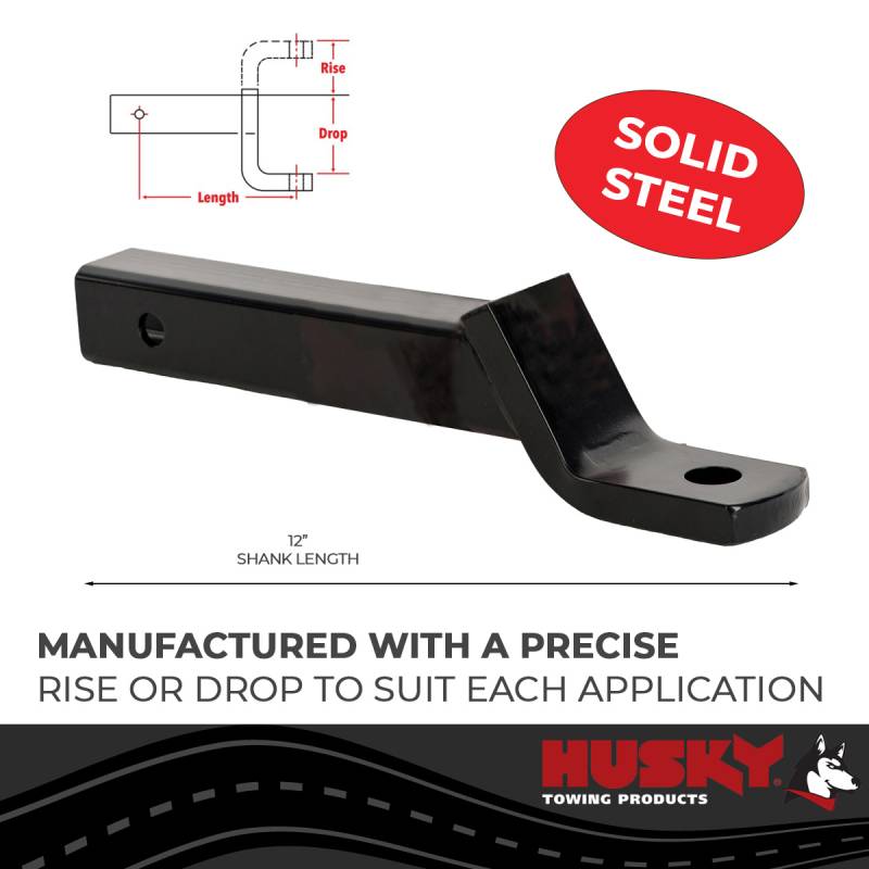 Fits 2" Recvr 6K Gross Wt 2-1/4" Drop/1" Rise 12" Shank Length 1" Ball Shank Dia The best way to even out a load is to select the best fitting ball mount. Ball mounts vary by weight rating, shaft length, and rise or drop measurements. Husky?s Class I and II Ball Mounts are manufactured with a precise rise or drop to suit each of the a Manufactured With A Precise Rise Or Drop To Suit Each Of The Applications Limited Lifetime Warranty